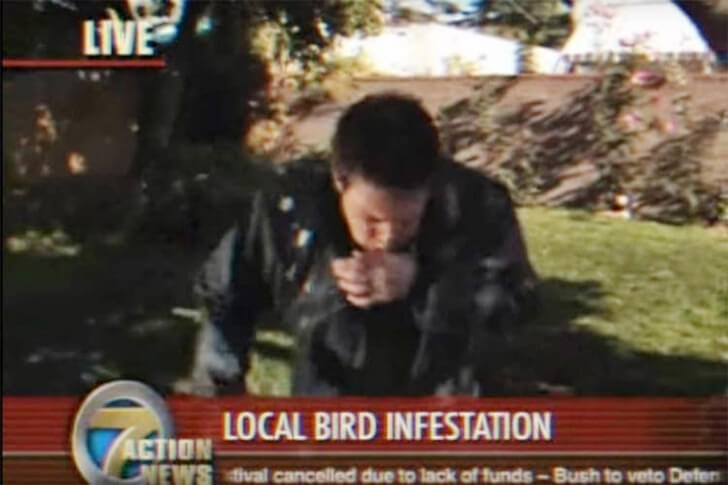 Ein Reporter war hier gerade dabei, über eine “Vogelplage“ im Wohnviertel zu berichten, als sich die Situation unerwartet drehte. Zunächst krischen die Vögel nur laut über ihm, während er sich noch darüber lustig machte und die Tiere als Störenfriede bezeichnete. Doch kaum stand er unter einem der Bäume, wurde aus Geschrei plötzlich Körperkontakt: Eine der Vögel stürzte sich direkt auf ihn und setzte zur Attacke an, live vor laufender Kamera.
