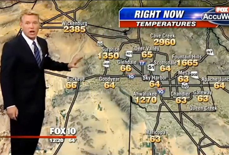 Cory McCloskey von Fox 10 wollte eigentlich ganz normal über das Wetter in Phoenix berichten, doch ein Tippfehler in der Grafik machte den Bericht zum Comedy-Highlight. Auf dem Bildschirm erschienen Temperaturen, die eher nach Weltuntergang als nach Wüstenklima aussahen: mehrere hundert Grad, zerstörerische Zahlen, Orte im “Schmelzmodus“.