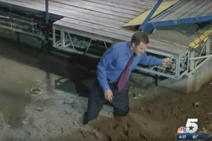Bei einem Bericht über den sinkenden Wasserstand eines Sees wollte ein Reporter zeigen, wie stark sich das Ufer zurückgezogen hatte. Also sprang er demonstrativ auf den Bereich, der eigentlich schon als trocken galt. Nur leider sah es fester aus, als es war: Statt sicheren Schrittes landete er knietief im Schlamm und blieb feststecken, während die Kamera weiterlief und im Studio die ersten Lacher ausbrachen.
