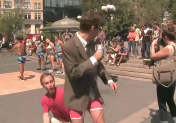 Auf dem Washington Square wollte ein Reporter eigentlich ganz normal seine Live-Schalte durchziehen, doch ein Unbekannter hatte andere Pläne. Während der Beitrag lief, schlich sich der Mann von hinten an und zog dem Reporter plötzlich die Hose herunter und damit stand seine pinke Unterhose im Mittelpunkt der Übertragung. Der Reporter versuchte instinktiv, den Täter zu verfolgen, doch die halb heruntergerutschte Hose ließ den Versuch, den Mann einzuholen, eher nach Slapstick aussehen.