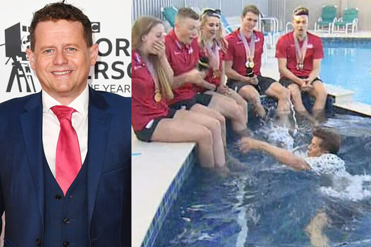 BBC-Sportmoderator Mike Bushell war 2018 bei den Commonwealth Games unterwegs und wollte eigentlich nur ein entspanntes Interview mit mehreren Schwimmern führen. Stattdessen legte er unfreiwillig einen denkwürdigen Abgang hin! Beim Versuch, sich vorsichtig in den flachen Beckenbereich zu stellen, verlor er das Gleichgewicht und landete komplett im Wasser, nur Sekunden nachdem er selbst noch gewarnt hatte, dass seine Verkabelung nicht nass werden dürfe.