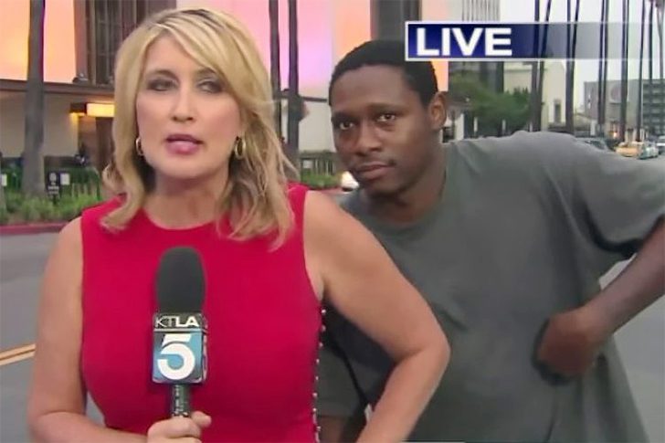 Wendy Burch war gerade mitten in einer Live-Reportage für KTLA, konzentriert, professionell, alles nach Plan, bis ein Mann sich langsam von hinten ins Bild schlich. Ohne Vorwarnung stand er plötzlich direkt hinter ihr, fast schon zu nah. Als Wendy sich umdrehte und ihn bemerkte, fuhr ihr der Schreck durch alle Glieder und sie stieß einen lauten Schrei aus. Der Mann, der offenbar nur “witzig“ sein wollte, erschrak selbst mindestens genauso und flüchtete panisch aus dem Bild, als wäre er der Überfallene.