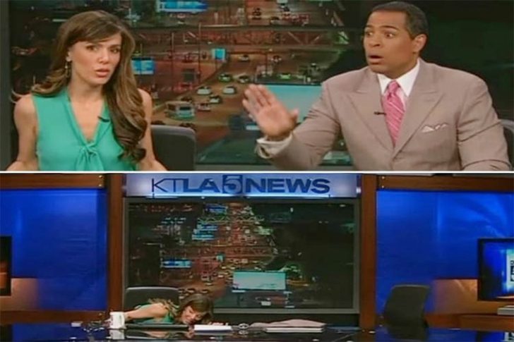 Bei einer Livesendung von KTLA gerieten die Moderatoren in eine unerwartet gefährliche Situation, als plötzlich ein starkes Erdbeben das Studio erschütterte. Während die Kameras weiterliefen, reagierte einer der Moderatoren reflexartig, schrie auf und duckte sich unter das Pult, während sein Kollege sichtlich versuchte, Ruhe zu bewahren. Für die Zuschauer wirkte der Moment dramatisch und chaotisch zugleich, vor allem weil er sich ohne Vorwarnung mitten in einem normalen Nachrichtenblock ereignete.